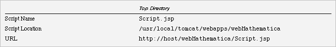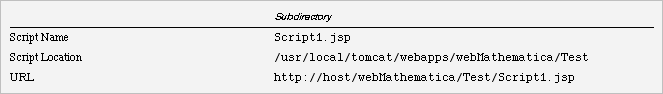 In this second table, Script1.jsp is located in a subdirectory of the webMathematica web application directory, for example, /usr/local/tomcat/webapps/webMathematica/Test. The URL http://host/webMathematica/Test/Script1.jsp will find this JSP.