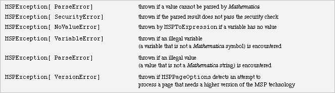 A number of MSP commands throw an MSPException when some error situation occurs. These are caught by the page processing code, but it would be permissible for a page author to catch them and process them in some intermediate step.