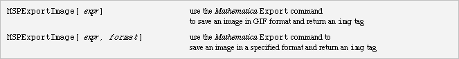 MSPExportImage is used to save an image using the Mathematica command Export. If the first argument is a graphics object or a Cell or BoxData object, it is displayed directly. If it is a general expression, it is formatted with TraditionalForm. A further discussion on formatting mathematics and graphics is given in the section on Displaying Mathematics and Graphics.