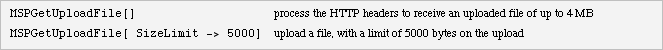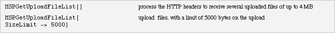 This provides a useful utility function for uploading files from the client to the server using multipart/form-data submissions. The contents of the file are saved in a new file on the server, and the name of this file is returned. The file on the server will eventually be cleared in a way similar to the clearing of image and other temporary files. The result of MSPGetUploadFile is a list of rules that show the filename on the server, the original filename on the client, and the content type.