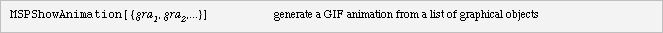 MSPShowAnimation is a convenient way to generate animated GIF images. The argument must be something that evaluates to a list of graphics objects. A further discussion on formatting mathematics and graphics is given in the section on Displaying Mathematics and Graphics.