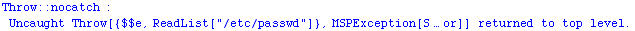 Hold[Throw[{$$e, "ReadList[\"/etc/passwd\"]"}, MSPException["SecurityError"]]]