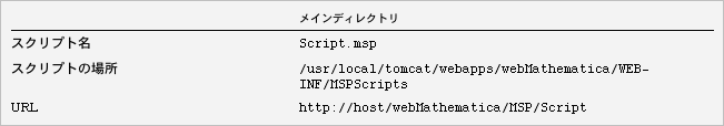 最初の表ではScript.mspというMSPスクリプトがメインディレクトリ/usr/local/server/filesに置かれています.これにはhttp://host/webMathematica/MSP/ScriptというURLでアクセスすることができます.設定パラメータのMSPDirectoryがこのディレクトリの場所を指定します.この場所はMathematica $Pathに加えられます.