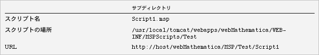 2番目の表ではScript1.mspがメインディレクトリのサブディレクトリ/usr/local/tomcat/webapps/webMathematica/WEB-INF/MSPScripts/Testに置かれています.このMSPスクリプトにはhttp://host/webMathematica/MSP/Test/Script1というURLでアクセスすることができます.Mathematica のカーネルでは/usr/local/tomcat/webapps/webMathematica/WEB-INF/MSPScriptsと/usr/local/tomcat/webapps/webMathematica/WEB-INF/MSPScripts/Testという2つのディレクトリが$Pathに加えられます.